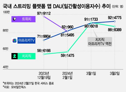 이같은 노림수는 적중했다. 2월 들어 DAU가 급격하게 증가한 치지직은 지난달 13일 DAU 65만1692명을 기록하며 출시 후 처음 트위치(60만8093명)를 제치고 2위에 올라섰다. 이후 꾸준히 이용자 수를 확보한 치지직은 결국 출시 3개월 만에 아프리카TV까지 넘어섰다.
