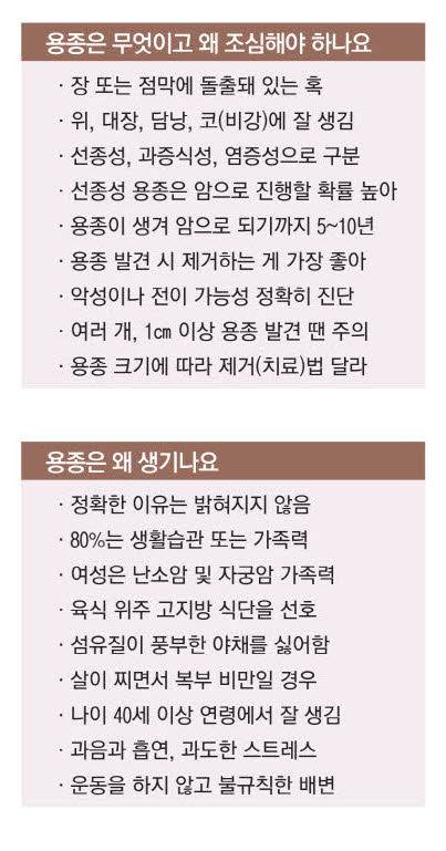건강검진 때 대장내시경이나 위내시경을 받게 되면 간혹 용종(茸腫)이 있다는 얘기를 듣게 된다. 용종은 글자 그대로 점막이나 장막에 돌출되어 있다는 뜻이다. 영어로는 폴립(polyp)이라고 한다. 용종은 대장을 비롯해 다른 소화 장기 및 점막이 있는 모든 기관에서 생길 수 있다. 대표적인 용종은 대장 용종, 위 용종, 담낭 용종, 비(鼻) 용종 등이다. 주로 40세 이후에 발생하며 연령이 높아질수록 발생 빈도가 올라간다.