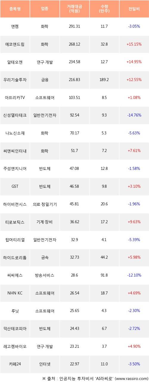 에코앤드림, 알테오젠, 우리기술투자 등은 전일 대비 주가가 상승했고, 엔켐, 신성델타테크, 나노신소재 등은 주가가 하락했다.