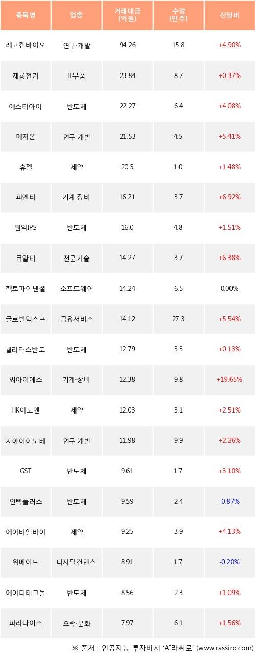 기관 투자자의 순매수 상위 20개 종목은 레고켐바이오, 제룡전기, 에스티아이, 메지온, 휴젤, 피엔티, 원익IPS, 큐알티, 헥토파이낸셜, 글로벌텍스프리등이다.