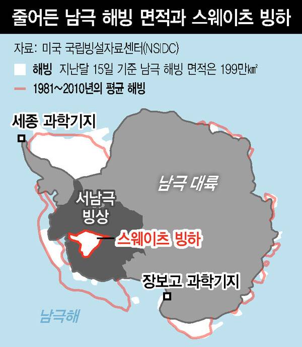 남극은 본초 자오선(경도 0도)을 기준으로 서남극과 동남극으로 나뉜다. 1988년 지은 세종과학기지가 서남극에, 2014년 완공한 장보고과학기지가 동남극에 있다. 이 박사는 따뜻한 물이 침투하기 쉬운 지형 탓에 서남극 얼음이 더 빨리 녹고 있는 상황을 설명하며 이렇게 말했다.