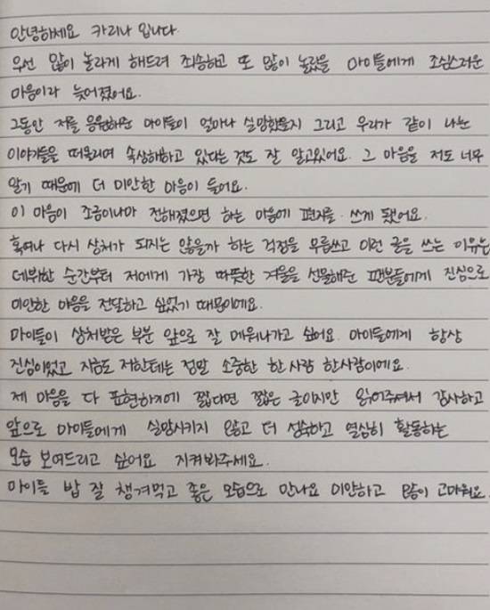 이어 "얼마나 실망했을지, 속상해하고 있다는 것 잘 알고 있다. 그 마음 저도 잘 알기에 더 미안한 마음이 든다"며 "혹여나 다시 상처가 되지는 않을까 하는 걱정을 무릅쓰고 이런 글을 쓰는 이유는 진심으로 미안한 마음을 전달하고 싶었기 때문"이라고 전했다.