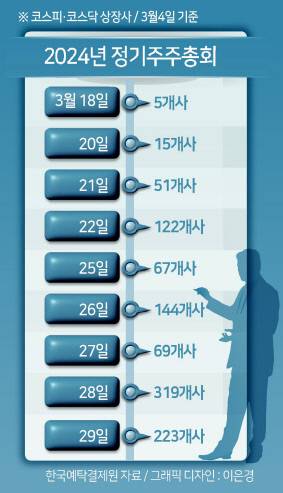 6일 한국예탁결제원에 따르면 4일 기준 정기 주주총회(주총)이 가장 몰린 날은 오는 28일로, 코스피·코스닥 상장사 319곳에 달한다.