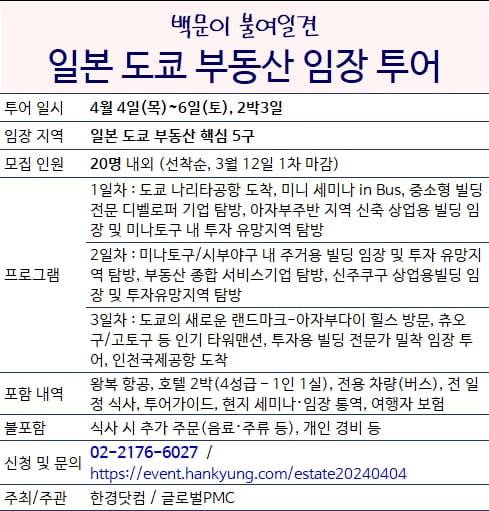 이런 가운데 한경닷컴과 글로벌PMC가 ‘일본 도쿄 부동산 임장 투어’를 마련했다. 오는 4월 4일(목)부터 6일(토)까지 2박3일간 진행되는 이번 투어는 일본 부동산 시장에 대한 이해는 물론 실제 거래 가능한 매물을 중심으로 구성한 압축적인 실전 프로그램이다.