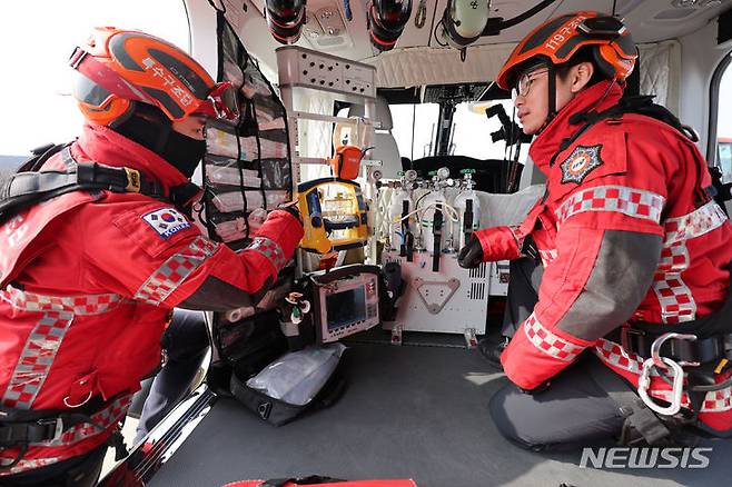 [인천=뉴시스] 전진환 기자 = 6일 오전 인천 중구 인천소방항공대에서 119구조대 특수구조단 대원들이 신규 교체한 다목적 소방헬기에서 구조 장비를 점검하고 있다. 인천소방본부는 1995년 도입한 소방헬기 BELL-230를 대체할 AW139 기종의 다목적 소방헬기를 도입, 인천 전역에서 응급환자를 이송할 뿐만 아니라 산불 등 각종 화재 진압에도 투입할 예정이다. 2024.03.06. amin2@newsis.com