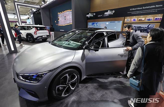 [서울=뉴시스] 김진아 기자 = 6일 서울 강남구 코엑스에서 열린 'EV 트렌드 코리아 2024' 기아 부스에서 관람객들이 전기차를 살펴보고 있다. 2024.03.06. bluesoda@newsis.com