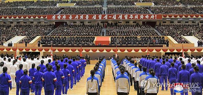 (평양 조선중앙통신=연합뉴스) 지난 5일 평양체육관에서 농업근로자체육경기대회-2024 결승경기가 열렸다고 조선중앙통신이 6일 보도했다. 김덕훈 내각총리, 주철규 당 중앙위원회 부장, 김일국 체육상 등 평양시민들이 결승경기를 관람했다. 체육경기대회에서는 황해북도가 종합 1등을 했다. 2024.03.06