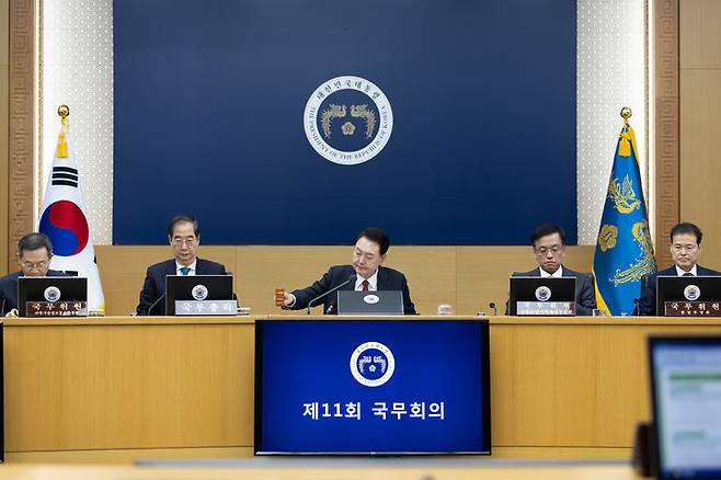 [서울=뉴시스] 윤석열 대통령이 6일 세종특별자치시 정부세종청사에서 열린 국무회의에서 개회 선언을 하고 있다. (사진=대통령실 제공) 2024.03.06. photo@newsis.com *재판매 및 DB 금지