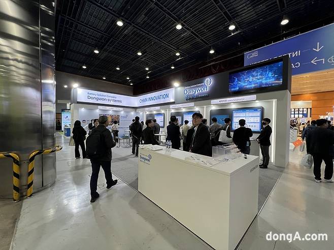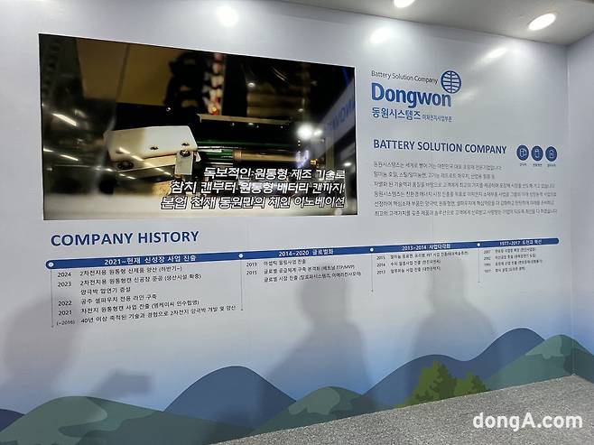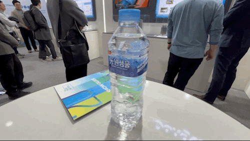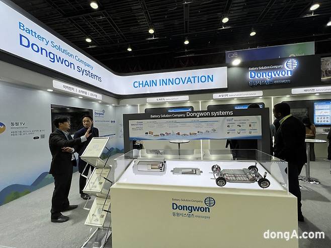 코엑스 C홀에서 LG에너지솔루션과 SK온 부스를 지나 D홀로 넘어오면 정면에 바로 동원시스템즈 전시관이 마련됐다. 가시성 좋은 곳에 부스를 마련해 방문객 유입을 유도한 모습이다. 부스 내부에는 ‘동원샘물’이 비치돼 방문객들이 이용할 수 있도록 했다. 동원샘물은 지주회사 동원산업의 식·음료 계열사 동원F&B의 생수 브랜드다.