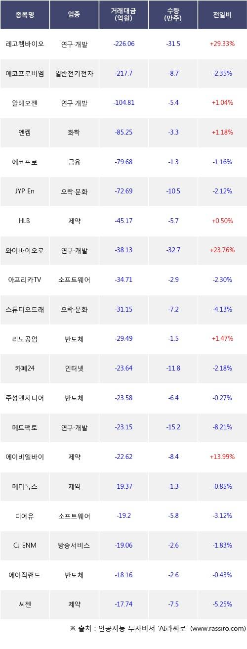 기관 투자자의 순매도 상위 20개 종목은 레고켐바이오, 에코프로비엠, 알테오젠, 엔켐, 에코프로, JYP Ent., HLB, 와이바이오로직스, 아프리카TV, 스튜디오드래곤등이다.