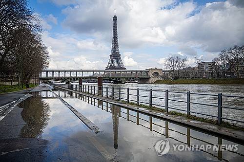 epa11202069 View of the flooded promenade on the bank of the Seine river, with the Eiffel tower seen in the background, in Paris, France, 06 March 2024. Sections of the Seine river bank have been closed for pedestrians in recent days due to rising water levels and flooding alerts. The river has been placed under increased surveillance by city services following a rainy winter. EPA/CHRISTOPHE PETIT TESSON