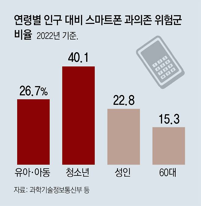 두 기관이 지난해 발표한 ‘2022년 스마트폰 과의존 실태조사’를 보면 유아·아동 스마트폰 과의존 위험군은 2020년 27.3%, 2021년 28.4%, 2022년 26.7%로 꾸준히 20% 후반대를 유지했다. 또 부모에게 유아 자녀의 스마트폰 과의존 원인을 물었을 때 돌아온 답변 중에는 ‘스마트폰 이용 훈육 방법을 잘 몰라서’가 38.5%로 가장 많았다.