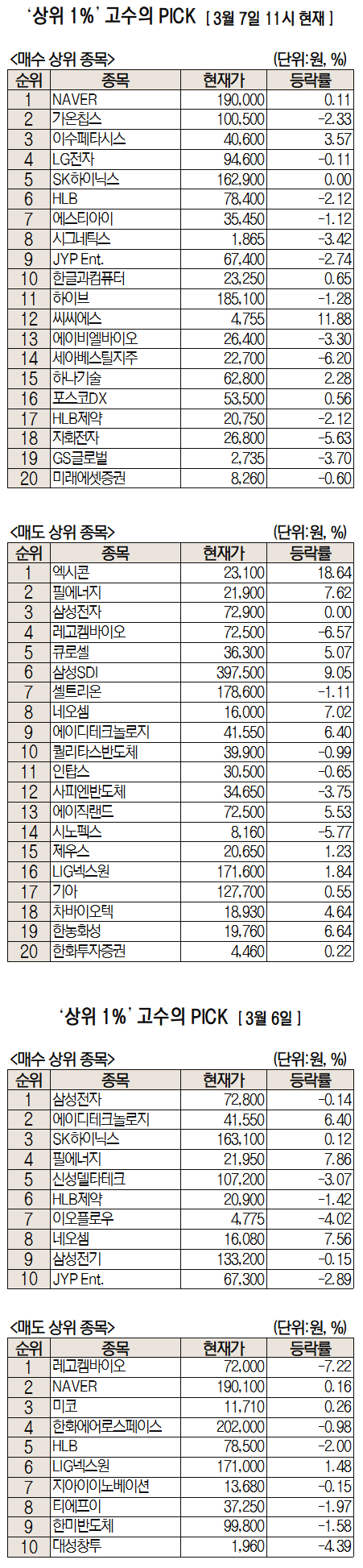 미래에셋증권은 자사 고객 중에서 지난 1개월간 수익률 상위 1% 투자자들의 매매 종목을 집계해 실시간·전일·최근 5일 기준으로 모바일트레이딩시스템(MTS)상에서 공개하고 있다. 이 통계 데이터는 미래에셋증권의 의견과 무관한 단순 정보 안내이며 각각의 투자자 개인에게 맞는 투자 또는 수익 달성을 보장하지 않는다. 또 테마주 관련종목은 이상 급등락 가능성이 있으므로 유의해야 한다.