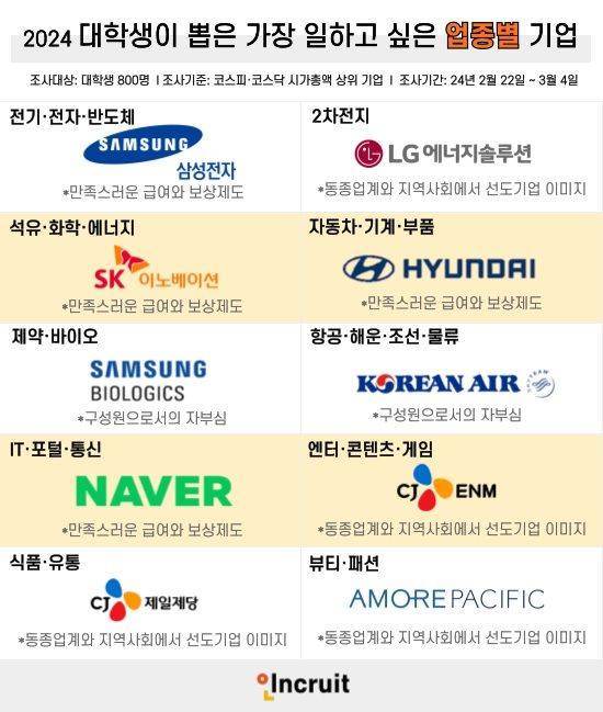 HR테크 기업 인크루트는 7일 전국 대학생 800명을 대상으로 조사한 '2024 대학생이 뽑은 가장 일하고 싶은 업종별 기업' 조사 결과를 공개했다.