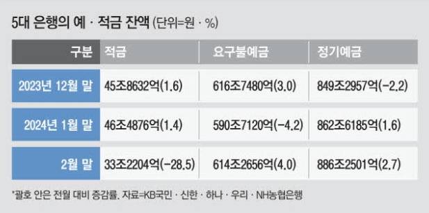 7일 5대 시중은행(KB국민·신한·하나·우리·NH농협)을 분석한 결과 지난 1월 46조4876억원이던 적금 잔액은 2월 들어 13조2671억원 줄어든 33조2204억원으로 내려앉았다.