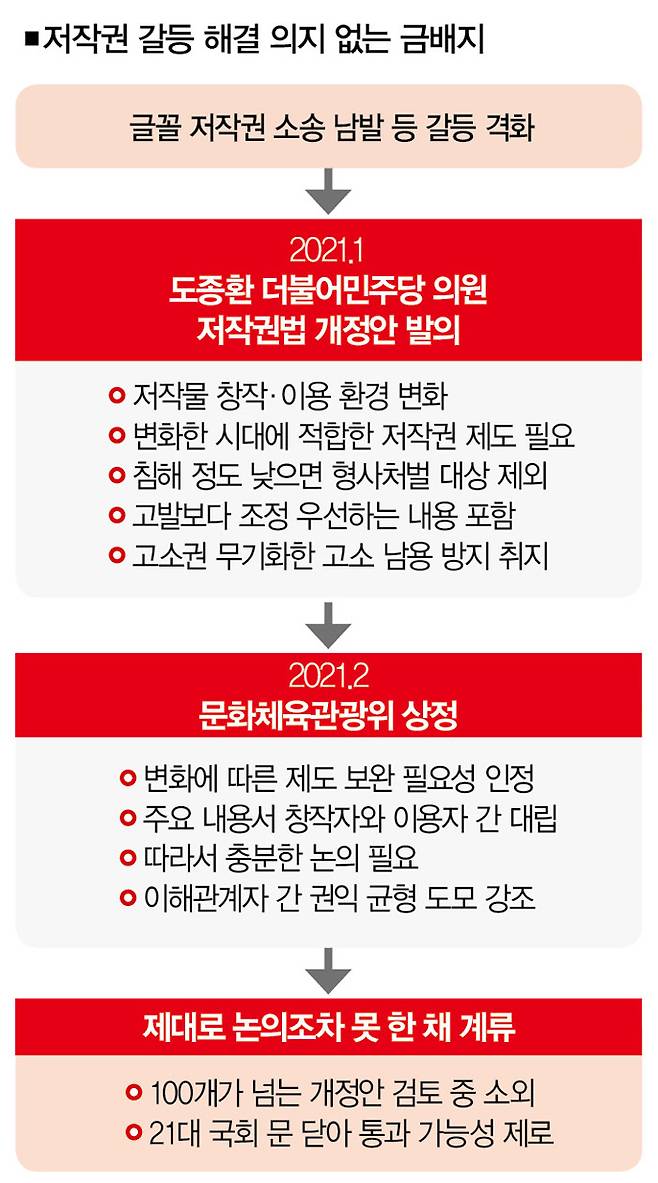 그럼에도 시스템 개선은 요원하다. 2021년 1월 도종환 더불어민주당 의원은 저작권 침해 정도가 경미한 경우 형사처벌 대상에서 제외하고, 고발보다 조정을 우선시하는 내용을 담은 저작권법 개정안을 내놨다. 현행법상 저작권 침해가 친고죄로 규정된 탓에 고소권을 통해 형사벌을 무기화하는 등의 남용을 막겠다는 취지에서다.