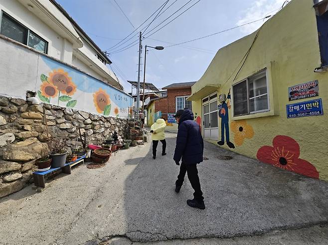 좁은 골목길엔 벽화가 그려져 있어서 마치 통영의 동피랑을 닮은 듯하고, 부산 영도의 문화마을을 생각하게 했다. 인적이 뜸한 골목 골목마다 벽화가 그려져 있어 화사했고 마치 동화의 나라에 온 것 같기도 했다. 좁은 골목길을 따라 계속해서 언덕길을 오르다 보니 마을의 맨 꼭대기에는 마을과 바다를 한눈에 내려다보는 작고 아담한 '이수도 교회'가 있었다.