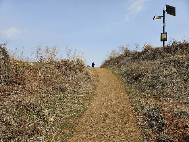 반전이다. 막상 언덕길을 한참 더 올라가보니 선착장에서 바라보았던 이수도 마을은 작은 섬 마을인 줄 알았는데, 그 뒤로 보이는 면적은 훨씬 넓었다. 앞서 보았던 사람 사는 마을 풍경은 조용하면서도 활기가 느껴진 반면, 붉은 황토 흙으로 된 제법 넓게 펼쳐진 언덕 길과 눈앞에 펼쳐지는 풍경은 전혀 다른 분위기였다. 마치 오래 전 본 영화 <서편제>의 한 장면을 연상케 했다.