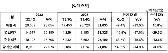 2023년 4분기는 매출 257억 원, 영업이익 92억 원, 당기순이익 77억 원으로, 전분기 대비 각 47.4%, 116.4%, 140.9% 올랐으나, 전년동기대비는 2022년 4분기 중국 '열혈강호 온라인' 재계약 일회성 금액 500만 달러가 반영돼 각 -13.0%, -37.6%, -14.0% 줄었다.
