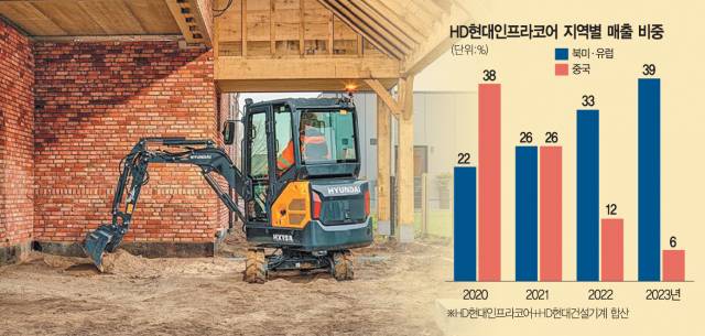 반면 같은 기간 북미와 유럽은 22%에서 42%로 두 배 가까이 확대됐다. 실적 방어의 선봉장은 북미였다. 인프라 건설 수요가 크게 늘면서 판매량이 급증했다. HD현대건설기계의 지난해 북미 매출은 약 1조 원으로 글로벌 전체 매출의 4분의 1을 차지했다.