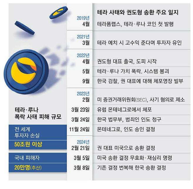 '가상화폐 왕국의 황태자'에서 글로벌 도망자 신세로 전락했던 권도형 테라폼랩스 대표(32·사진)가 해외 도피 약 2년 만에 한국으로 송환될 전망이다. 앞서 권씨가 현재 체류하고 있는 몬테네그로 법원이 미국 인도 방침을 밝혔지만, 한국행을 원했던 권씨 측 항소가 7일(현지시간) 받아들여졌기 때문이다. 미국으로 송환되면 100년 이상 징역형도 가능하지만, 한국에서는 최대 징역 40년이다.