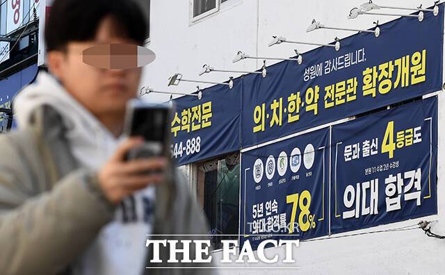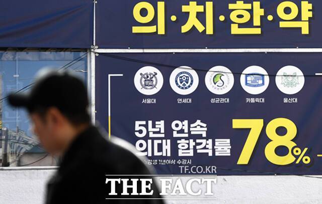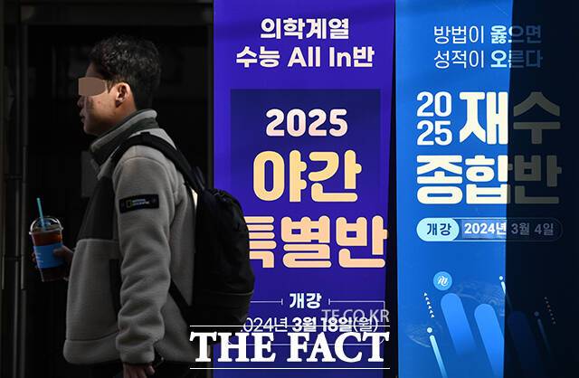 [더팩트ㅣ서예원 기자] 정부가 '의대 정원 증원' 방침을 밝힌 가운데 8일 서울 서초구의 한 대형 학원에 의학 계열 수능 강의 야간 특별반 모집 입간판이 걸려있다.