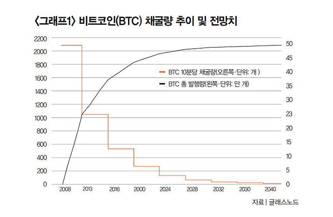 "비트코인 발행 개수는 2100만 개로 한정돼 있고, 4년마다 채굴량은 절반으로 줄어든다(그래프1 참조). 비트코인이 처음 채굴된 2008년에는 10분마다 50개씩 채굴되다가 4년이 지난 2012년 1차 반감기 이후 25개로 줄었다. 2016년 2차 반감기와 2020년 3차 반감기를 거치면서 채굴량이 또다시 절반씩 줄어 현재 10분마다 6.25개씩 채굴되고 있다. 4차 반감기 이후에는 10분마다 비트코인이 3.125개 채굴된다. 과거 반감기마다 채굴량이 절반으로 줄어들면서 비트코인 가격이 폭등했다. 현재 투심이 쏠리는 것도 4차 반감기 이후 가격 상승이 예측되기 때문이다."