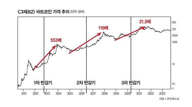 "수요공급의 원칙에 따라 반감기마다 비트코인 가격이 폭등했다. 수요가 비슷하다는 전제하에서 공급이 줄어들면 가격은 상승할 수밖에 없다. 1차 반감기에는 비트코인 가격이 최저점부터 최고점까지 550배가량 올랐고, 2차 반감기에는 110배가량, 3차 반감기에는 20배 넘게 올랐다(그래프2 참조). 다만 3차 반감기 이후 비트코인 가격이 더 상승할 수 있었는데, 2021년 4월 중국 정부의 비트코인 채굴 금지령 영향으로 상승 동력이 꺾이면서 충분히 상승하지 못했다. 4월 시작되는 4차 반감기는 악재보다 호재가 많아 슈퍼사이클이 예상된다. 따라서 3차 반감기 비트코인 가격 상승률인 20배는 거뜬히 넘어설 것으로 보인다. 3차 반감기 이후 최저점이 1만6000달러(약 2134만4000원) 정도였으니 30만 달러(약 4억 원), 국내 프리미엄을 적용하면 5억 원 정도까지 오를 것으로 전망된다."