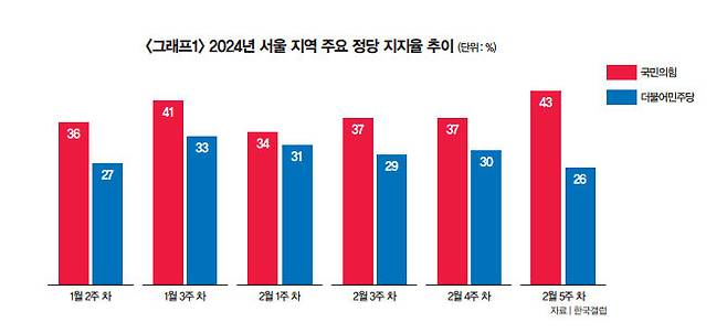 한 달 앞으로 다가온 4·10 총선의 최대 승부처 서울에서 국민의힘과 더불어민주당의 희비가 엇갈리고 있다. 국민의힘이 40%대 지지율에 안착한 반면, 민주당은 20%대 지지율로 되돌아간 것이다(그래프1 참조). 2012년 이후 3번의 총선에서 연이어 민주당 손을 들어준 서울이기에 최근 여론 추이가 새로운 변화를 만들어낼 수 있을지 주목되고 있다.