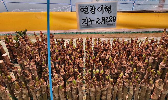 이날 두릅재배교육의 핵심은 촉성재배이었다. “일본에서 촉성재배법을 배워 농장에서 실험을 하고 있어요” 이 회장은 자신의 농원 둥지농지의 50평 규모의 하우스에서 촉성재배를 시범적으로 재배하고 있다. 이날 찾은 촉성재배 시범단지에는 10여가지의 두릅의 품종이 대목굵기와 온도, 물의 양이 다른 시범포에서 재배되고 있었다. 각기 대목에서 자라는 두릅순의 크기와 색깔 등이 확연히 달라보였다. 촉성재배 대목은 가을 낙엽이 진 후 한달 이상 영하의 날씨를 겪고 난 줄기를 50∼70㎝로 잘라 사용하면 된다. 또 대목은 50개씩 다발로 묶어 온실 구석에 쌓아놔야 한다. 습도는 85%이상 유지돼 한다.