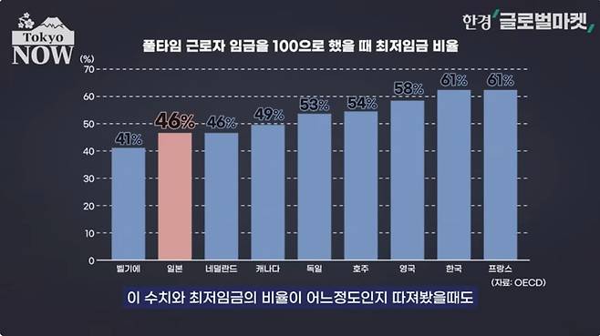 풀타임 근로자의 임금 중간값을 100으로 했을때 최저임금의 비율이 일본은 46%로 선진국 가운데 가장 낮은 편이었다. 프랑스와 한국은 61%에 달했다. 주요 경제대국들이 코로나19 기간에도 최저임금을 1~2%씩 인상한 반면 일본은 0.1% 오르는데 그친 결과다.