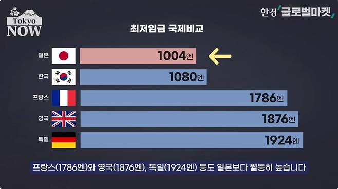 올해 주요국의 최저임금을 엔화로 환산해 보면 일본의 최저임금(1004엔)은 한국(1080엔)보다 낮다.