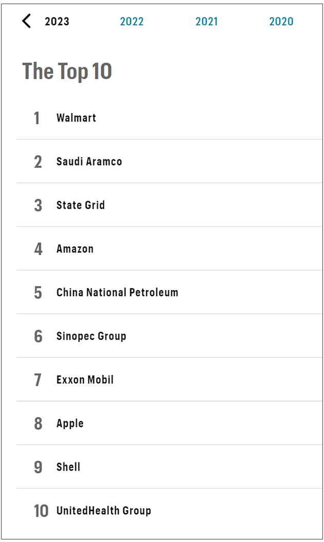 미국 경제전문지 포춘은 매년 글로벌 500대 기업의 순위를 발표합니다. 총매출액을 기준으로 순위를 매기는데, 지난해 발표를 기준으로, 미국 최대 유통업체 월마트(Walmart)가 1위를 차지했습니다. 벌써 10년째 1위 자리를 지키는 대단한 월마트입니다. 2위는 사우디아라비아 국영 석유회사 사우디 아람코(Saudi Aramco), 3위와 4위는 각각 중국 전력업체 스테이트 그리드(State Grid)와 미국 최대 전자상거래기업 아마존(Amazon)이 차지했습니다. 애플은 8위이고요.