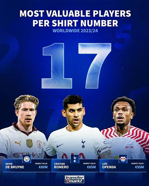 1위에 오른 선수는 로메로였다. 로메로는 몸값 6500만 유로(한화 약 938억 원)로 등번호가 17번인 선수 중 가장 가치 있는 선수가 됐다. 2위는 6000만 유로(한화 약 866억 원)를 기록한 케빈 데 브라위너였다. 3위는 RB 라이프치히의 공격수 로이스 오펜다였다. 오펜다의 가치는 5500만 유로(한화 약 793억 원)였다.