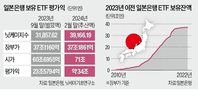 10일 니혼게이자이신문은 민간 경제연구소 닛세이기초연구소의 분석 결과를 인용해 2월 말 현재 일본은행이 보유한 ETF의 시가총액이 71조엔으로, 장부가보다 34조엔 높다고 보도했다. 71조엔은 한국의 올해 예산(656조원)과 비슷한 규모다.