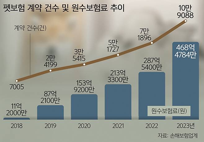 지난해 처음으로 펫보험을 계약한 건수도 급증했다. 5만8456건으로 전년 3만5140건에 비해 66.4%나 치솟았다. 펫보험 원수보험료(보험사가 보험계약자로부터 받은 보험료)는 468억원으로 전년 288억원보다 62.9% 올랐다.