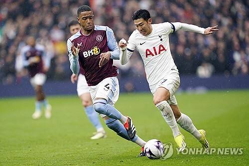 epa11211151 Ezri Konsa of Villa (L) and Son Heung-Min of Tottenham (R) in action during the English Premier League match Aston Villa vs Tottenham Hotspur, in Birmingham, Britain, 10 March 2024. EPA/TIM KEETON EDITORIAL USE ONLY. No use with unauthorized audio, video, data, fixture lists, club/league logos, 'live' services or NFTs. Online in-match use limited to 120 images, no video emulation. No use in betting, games or single club/league/player publications.