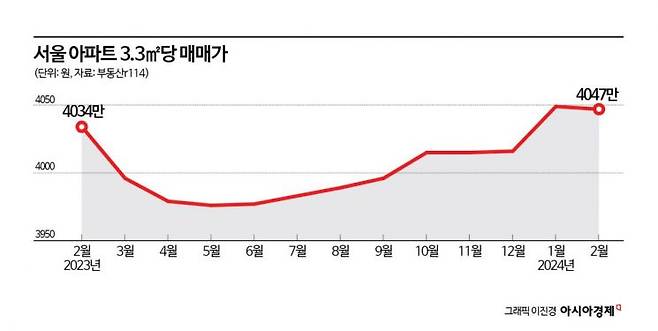 아직 가격 반등세가 나타나는 상황은 아니다. 부동산R114에 따르면 2월 기준 서울 아파트 3.3㎡당 매매가는 4047만원을 기록했다. 지난 1월(4049만원)보다 소폭 하락했고, 2023년 2월(4034만원)에 근접해졌다. 평당 매매가는 2023년 3~9월 3900만원대를 오르내리다 10월 이후 4000만원 초반대를 이어가고 있다.