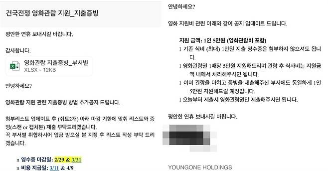 <오마이뉴스> 취재를 종합하면, 영원무역홀딩스는 2월께 '건국전쟁 영화관람 지원' 사내 공지를 통해 영화를 본 뒤 영화관람권과 영수증을 첨부하면, 식사비 1만 원을 지원하겠다고 밝혔다. 며칠 뒤 재공지에서는 "영화관람권 1매당 5만 원 지원해드린다"며 "영화관람권만 제출해주시면 된다"고 영화관람 지원을 대폭 늘렸다.
