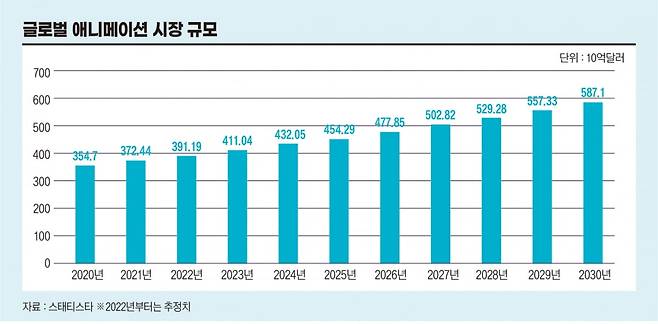 이에 따라 한국의 웹툰 산업이 성장한 만큼 애니메이션 산업 역시 육성해야 한다는 목소리가 높아지고 있다. 육성해야 할 가치는 충분하다. 거대한 시장 규모 때문이다. 독일 데이터 회사 스태티스타에 의하면 2030년 글로벌 애니메이션 시장 규모는 5871억 달러(약 780조원)에 달할 것으로 예측된다.
