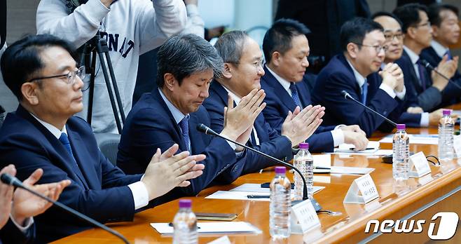 (서울=뉴스1) 안은나 기자 = 이병희 엘앤에프 사장(왼쪽부터), 송호준 에코프로 대표이사, 이석희 SK온 대표이사, 최윤호 삼성 SDI 대표이사, 박진원 LG에너지솔루션 부사장, 유병옥 포스코퓨처엠 대표, 김동욱 현대차 부사장, 정무경 고려아연 사장이 11일 오후 서울 강남구 한국기술센터에서 열린 제3차 수출·현안 전략회의 '민·관 합동 배터리 얼라이언스'에 참석해 안덕근 산업통상자원부 장관 모두발언을 들은 뒤 손뼉치고 있다. 2024.3.11/뉴스1