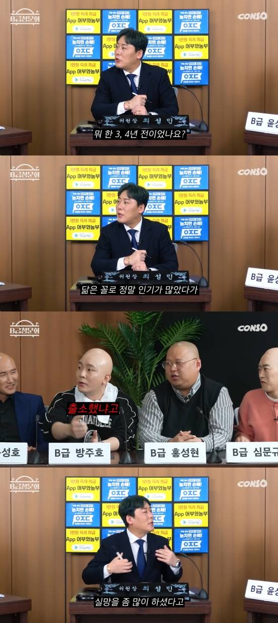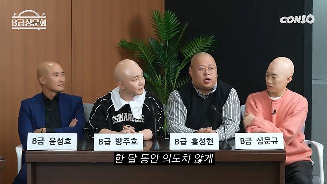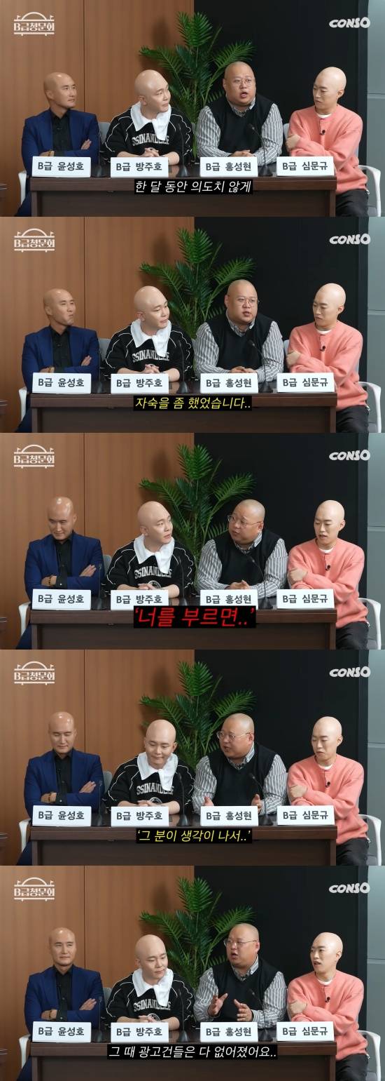 지난 8일 콘텐츠제작소 유튜브 채널에는 '조명이 필요없는 개그맨들! 모셔봤습니다!'라는 제목의 'B급청문회' 시즌2 39회 영상이 게재됐다. 이날 게스트로는 개그맨 윤성호, 방주호, 홍성현, 심문규가 출연했다.