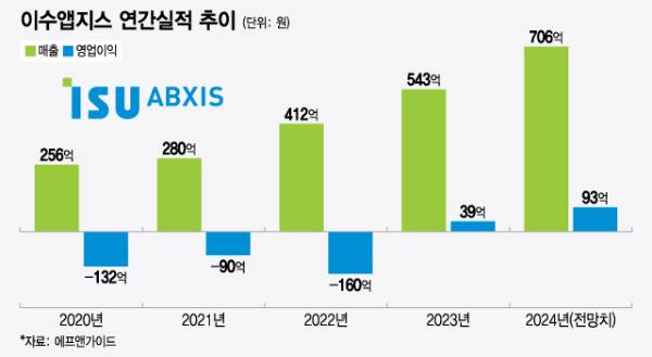 이수앱지스는 유전성 희귀질환 치료제를 중심으로 한 신약 개발사다. 대다수 신약 개발 바이오 기업들처럼 지속된 연구개발비 투입 등에 최근 수년간 적자를 이어왔지만, 지난해 매출액 543억원·영업이익 39억원으로 반전에 성공했다. 매출액은 전년 대비 31.8% 증가했고, 영업이익은 첫 흑자 달성이다. 전년 영업손실 160억원 대비 큰 폭의 수익성 개선이다.