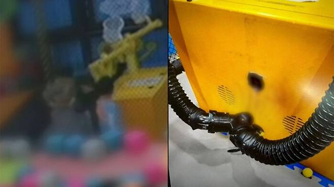바람을 불어 공을 발사하는 기구였는데, 뒷부분에 붙어 있던 호스가 떨어져 생긴 구멍에 손을 넣었다 사고를 당한 겁니다.