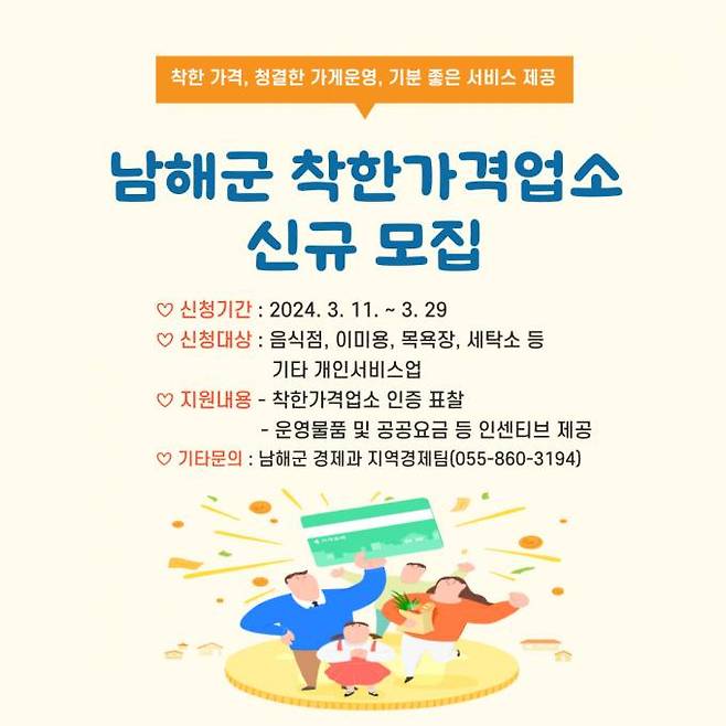 경남 남해군은 오는 29일까지 저렴한 가격과 차별화된 서비스로 지역 물가안정에 기여하는 '착한가격업소'를 신규 모집한다.