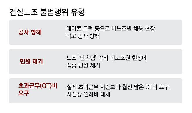 경기 소재 한 건축 현장의 하청업체 관계자는 11일 이렇게 말했다. 지금은 공사가 진행되고 있지만, 이곳은 지난해 말 착공에 들어가자마자 레미콘 시위로 몸살을 앓았다고 했다. 이 하청업체가 전국민주노동조합총연맹 산하 전국건설노동조합 소속 레미콘 기사 대신 비노조 레미콘 기사를 고용했다는 이유에서였다. 건설노조는 차량 서너 대를 동원해 주변 교통을 마비시켰고, 레미콘 수십 대가 인근에서 대기해야 했다. 교통 체증으로 인근 주민들의 민원도 빗발쳤다. 이틀간 시위가 이어진 끝에 이 하청업체는 노조 소속 레미콘 기사 15명을 다시 채용해야 했다. 하청업체 관계자는 “지난해 초부터 단속이 강화돼 대놓고 불법을 저지르진 않지만 달라진 건 없다”며 “노조의 방해 행위가 교묘해졌을 뿐”이라고 하소연했다.