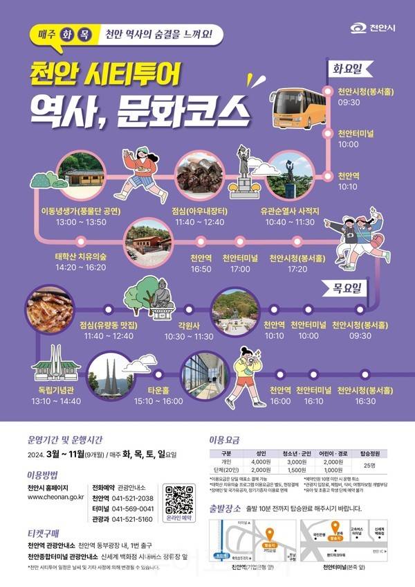 천안시청 봉서홀, 천안 터미널, 천안역 등 총 3곳에서 출발하는 천안시티투어는 천안시 문화관광 누리집 또는 천안역 관광안내소를 통해 전화예약도 가능하다.