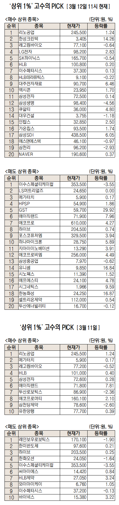 미래에셋증권(006800)에서 거래하는 고수익 투자자들이 12일 오전 가장 많이 순매수한 종목은 리노공업(058470)으로 나타났다. 한성크린텍(066980), 레고켐바이오(141080), LG전자, SK하이닉스 등도 순매수를 많이 한 종목이다.