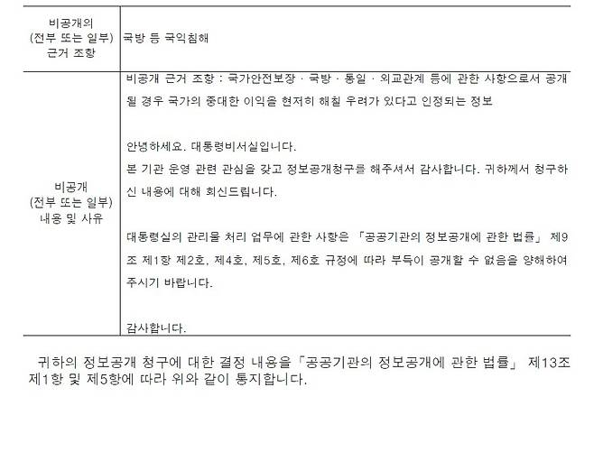 약 2주 만인 2월 6일, 돌아온 대통령실의 답은 "비공개 결정"이었습니다.