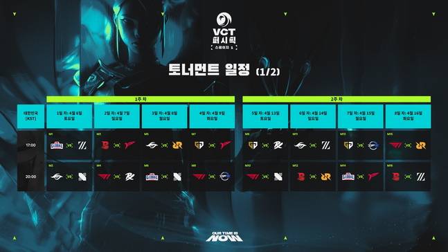 스테이지 1은 4월 6일(토) 개막해 5월 12일(일)까지 약 5주 동안 11개 팀의 치열한 대결이 펼쳐진다. 그룹 스테이지와 미드 시즌 플레이오프로 나뉘어 구성되며 그룹 스테이지는 4월 6일(토)부터 29일(월)까지, 미드 시즌 플레이오프는 5월 3일(금)부터 12일(일)까지 진행된다. 스테이지 1의 모든 경기는 오후 5시에 시작한다.